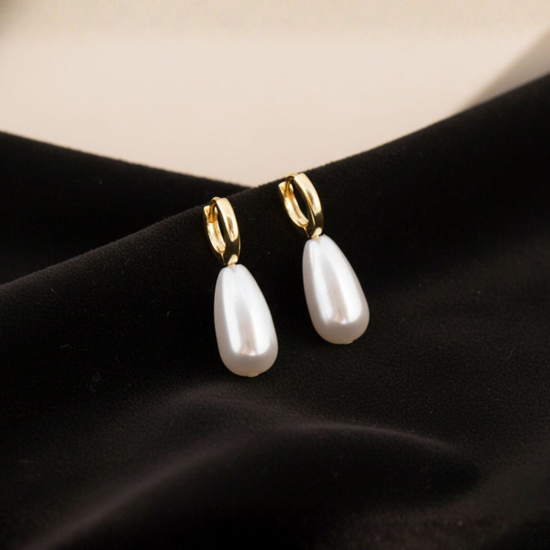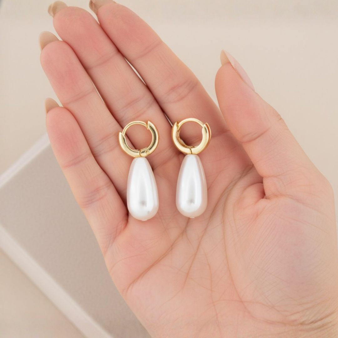 • Diseño tipo argolla pequeña con colgante de perla en forma de gota, símbolo de luz y equilibrio.