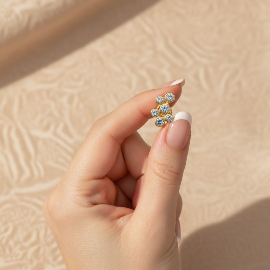 Una joya contemporánea que celebra la luz y la forma. Su diseño compuesto por múltiples zirconias en distintos tamaños crea un efecto tridimensional y sofisticado, ideal para quienes buscan distinción con un toque minimalista.
